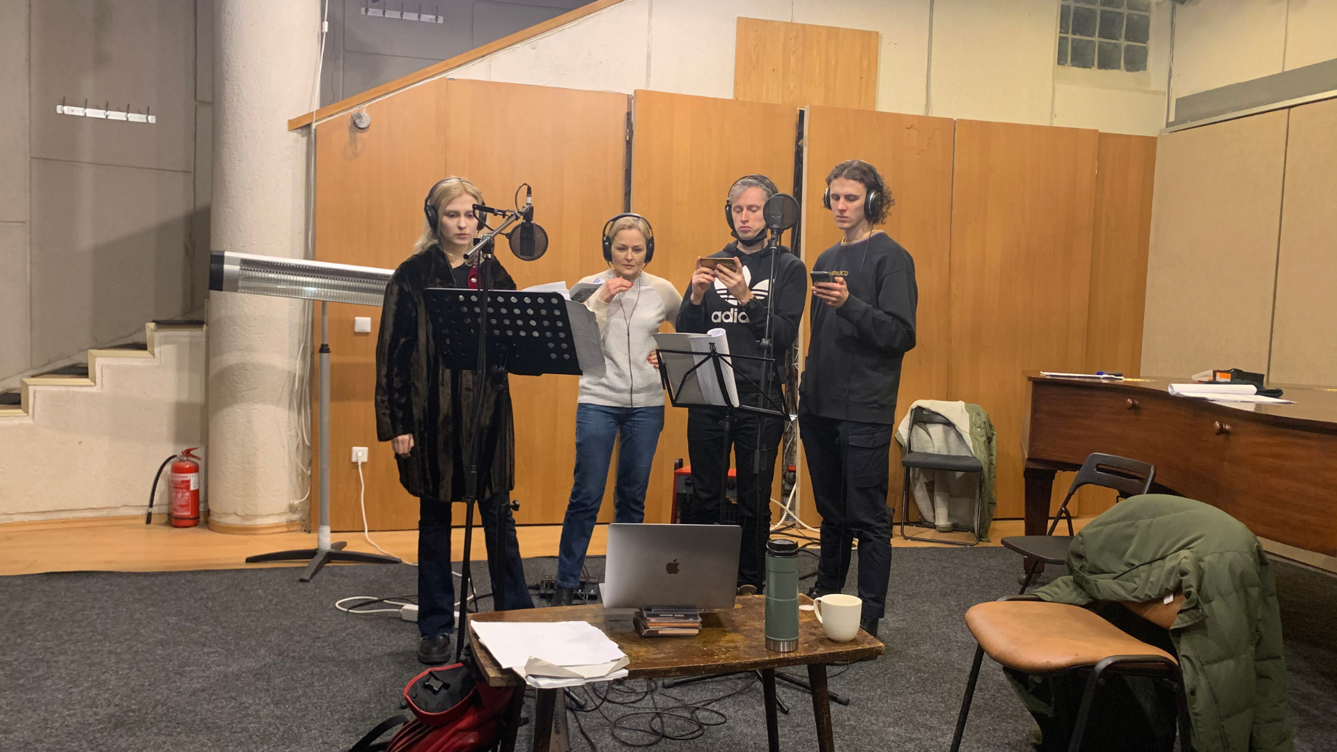 Dar repeticijų pradžioje visus aktorius… pasodinau prie kompiuterio su žaidimu „The Sims“. Kartu žaidėme „Simus“ kaip treniruotę – stebėjome, kaip virtualūs personažai juda, bendrauja, kokia mechaninė jų elgsena. Tai ne šmaikštus nuokrypis, o apgalvotas metodas: The Sims pasaulis padėjo mums atrasti suprogramuotus elgsenos kodus, kuriuos vėliau perkėlėme į sceną. Kūrėme personažus lyg žaidimo avatarus – jų judesiai kartojosi, emocijos buvo supaprastintos.
