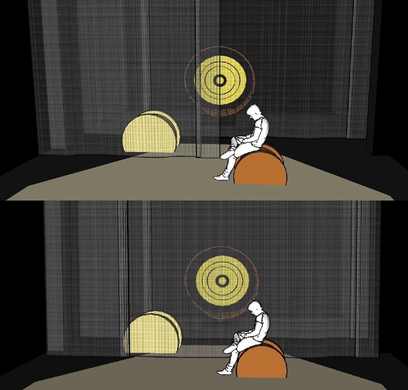 “When I began thinking about scenography, everything naturally revolved around the circle, which is why the performance features many circular forms. For me, the circle symbolizes both unity and perfection, something often encountered in spiritual practices—from circle dances to ritual sharing. Another idea I want to express through the circle is the cyclical nature of life: day after day, an endless routine, like a wheel we keep running in without stopping. The circle combines the desire for perfection and spirituality with the metaphor of everyday routine. Just like the camp participants try to escape daily work for a moment and ‘purchase’ a sense of spirituality and connection,” shares Kotryna K. Rupainytė about the creative process.